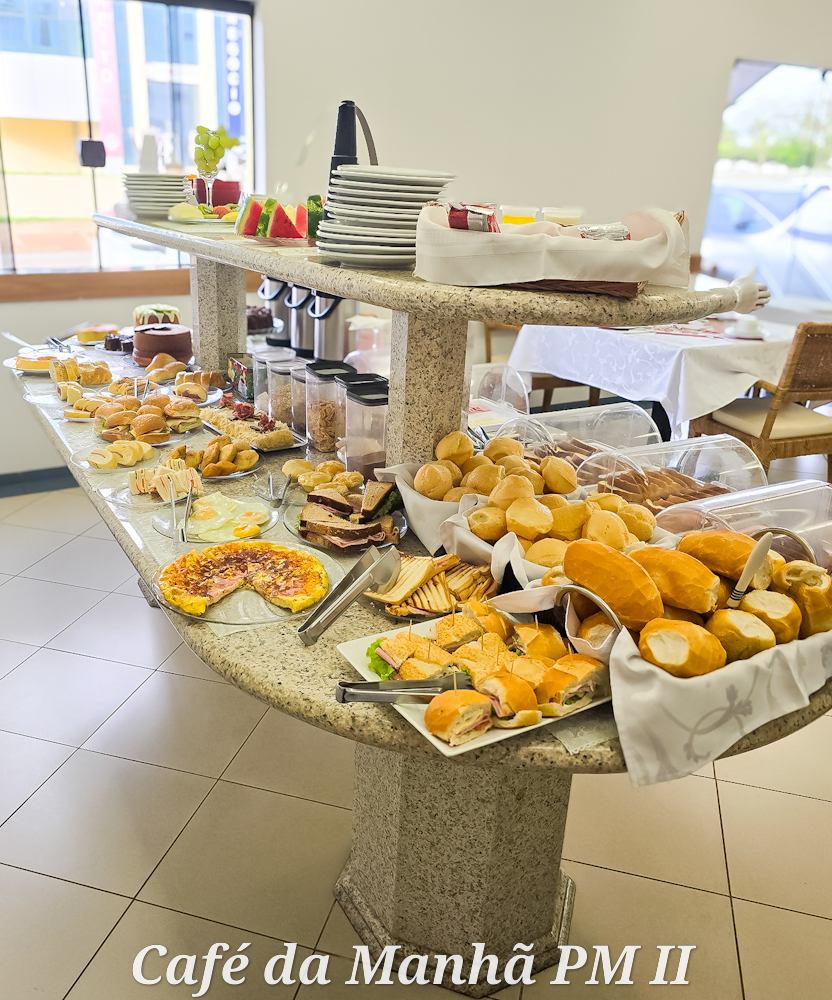 Algumas imagens da frente do Hotel Pequeno Mundo II, do estacionamento, café da manhã e Recepção,